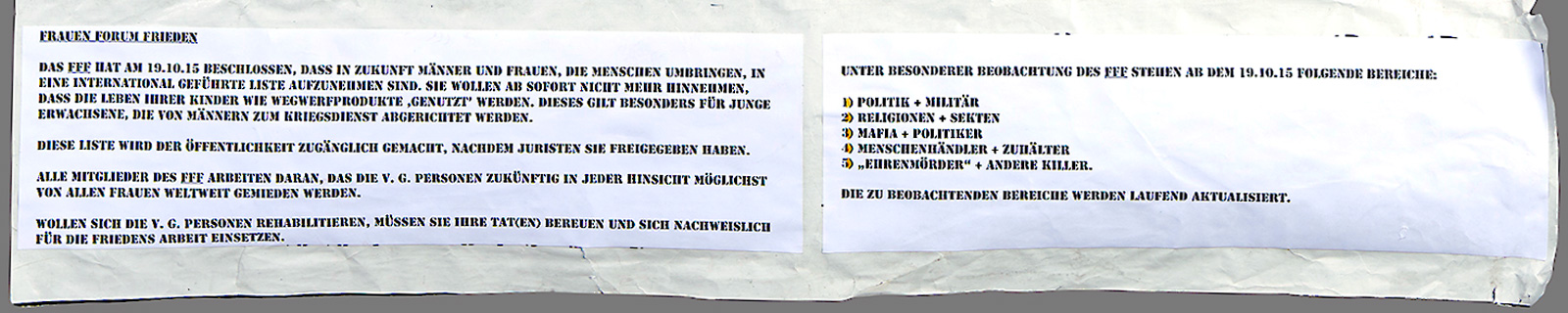 Das FFB (Frauen Forum Berlin) weist permanent darauf hin, dass das Führen von Kriegen in Zukunft illegal ist. Aufgrund der ständig zunehmenden Ausübung männlicher Gewalt werden die bestehenden, noch aus den vergangenen Jahrhunderten stammenden Ausnahmeregelungen außer Kraft gesetzt. Kein Mensch auf Erden kann sich somit noch auf sein Recht berufen, einen anderen Menschen umbringen zu dürfen und die bereits begangenen Taten werden früher oder später geahndet (siehe Bush und Blair). Jegliches Argument zur Entlastung des Täters oder der Täter ist hinfällig, es sei denn, dieses wird von der Weltgemeinschaft ausgesprochen, die einem wildgewordenen Diktator in den Arm fallen muss.